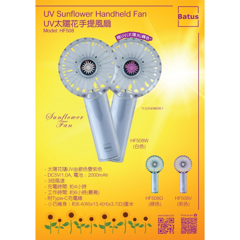 - 紫色太陽花隨UV顯現- DC5V/1.0A, 電池:2000mAh- 3段風速- 充電時間: 約4小時- 工作時間: 約6小時(最高)- 附Type-C充電線- 小巧機身:約6.4(W)x13.4(H)x3.7(D)厘米