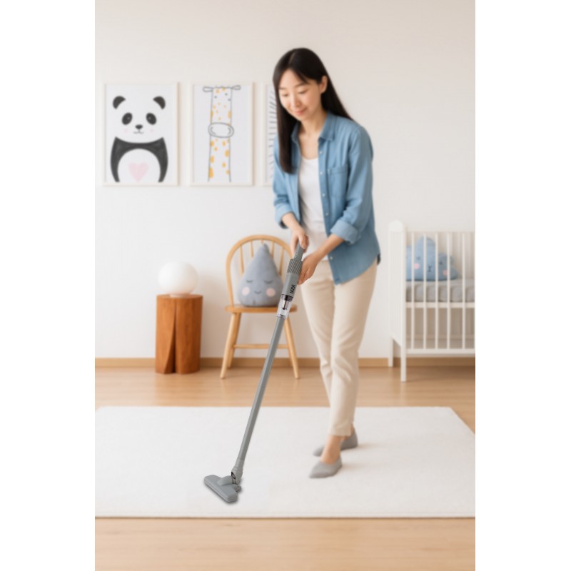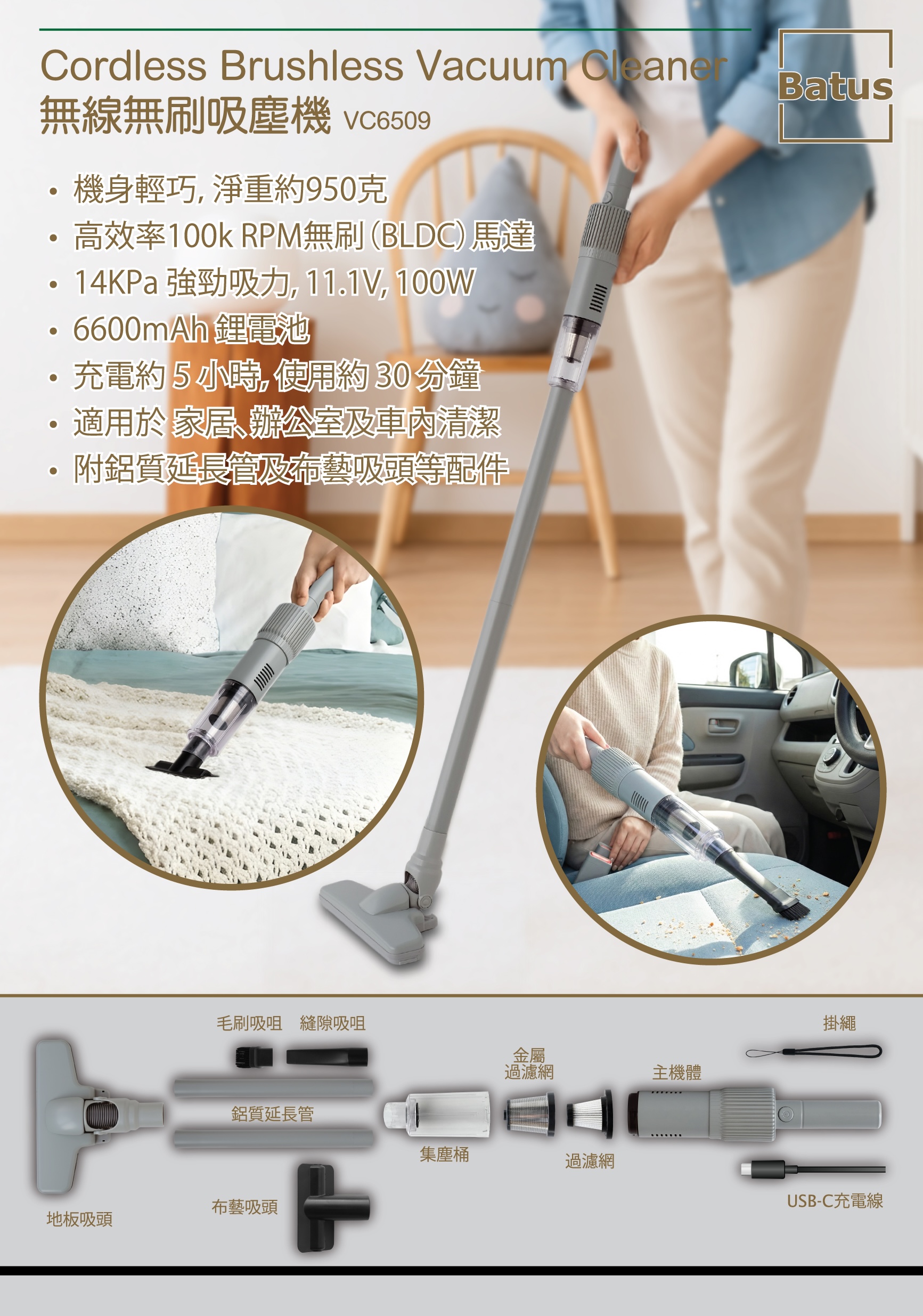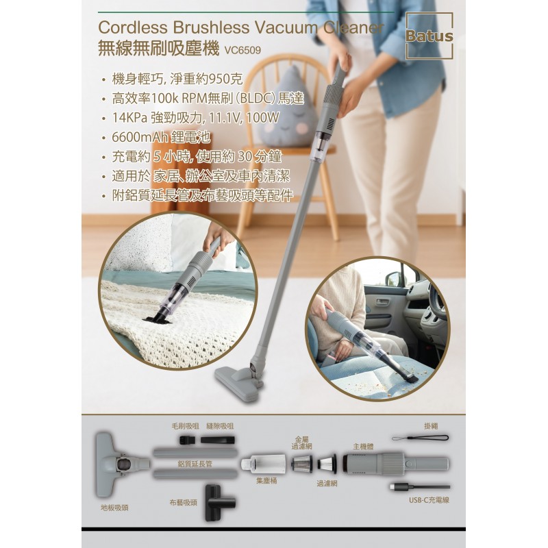 - 機身輕巧,淨重約950克- 高效率100k RPM無刷(BLDC)馬達- 14KPa 強勁吸力, 11.1V, 100W- 6600mAh 鋰電池- 充電約 5 小時,使用約 30 分鐘- 適用於家居、辦公室及車內清潔- 附鋁質延長管及布藝吸頭等配件