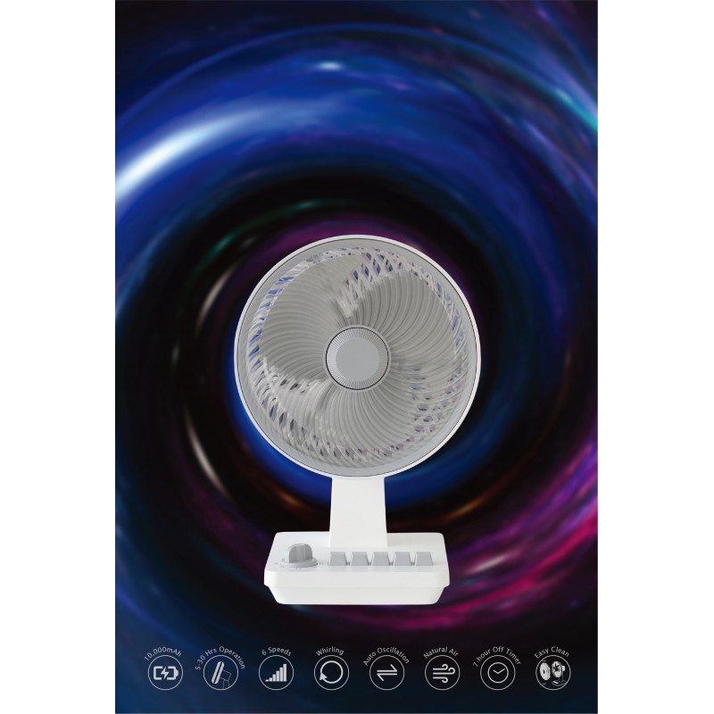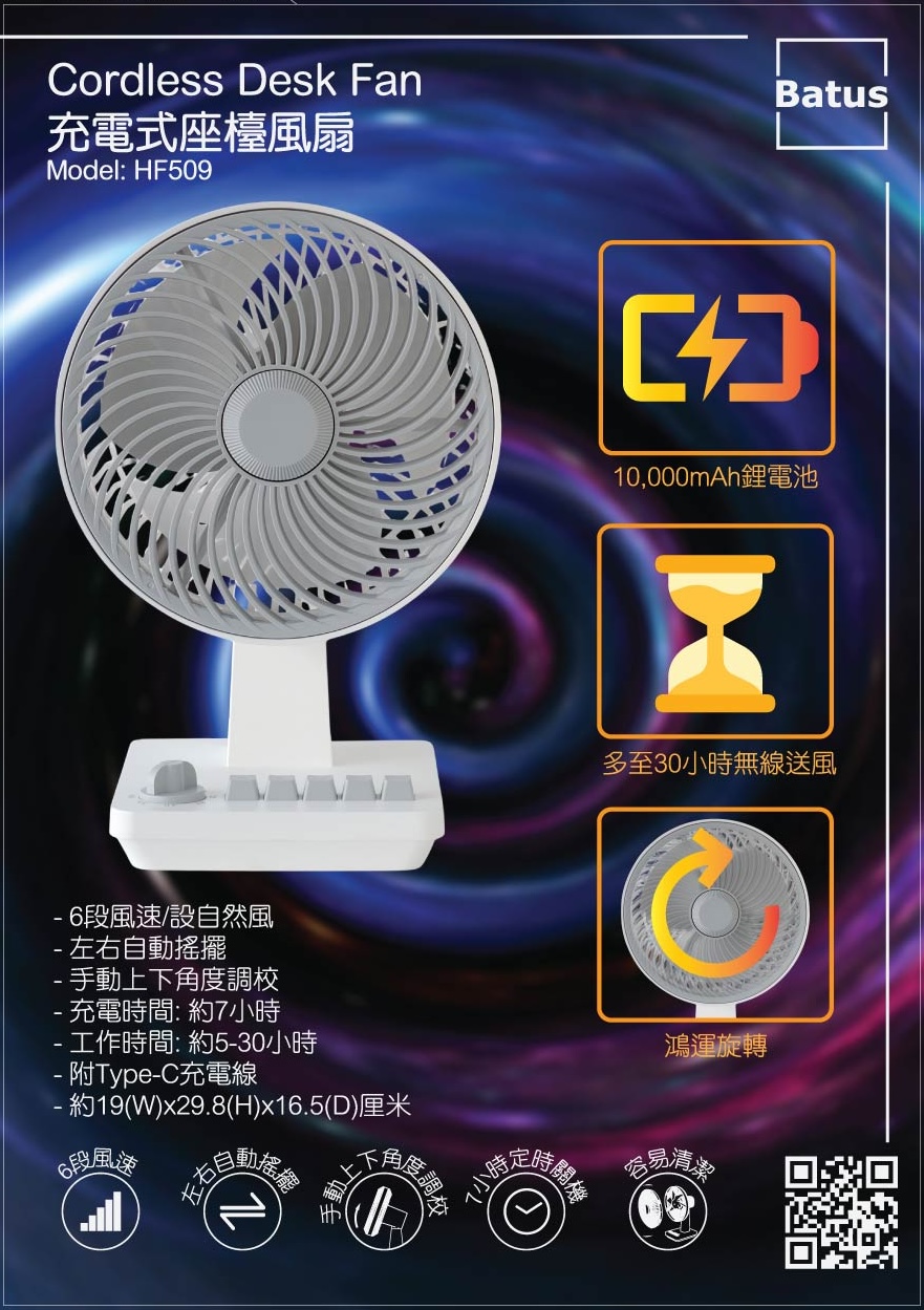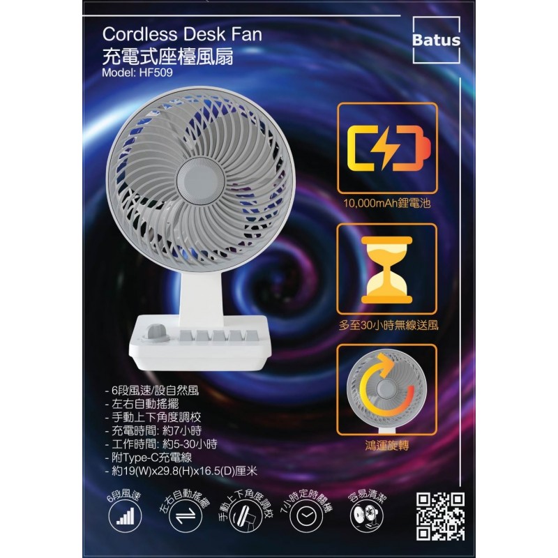 - DC5V/2.0A, 電池:10000mAh- 6段風速及自然風- 手動上下角度調校- 鴻運旋轉、左右搖擺- 1-7小時定時關機- 充電時間: 約7小時- 工作時間: 約5-30小時- 可拆洗前網;附Type-C充電線- 小巧機身:約19(W)x29.8(H)x16.5(D)厘米