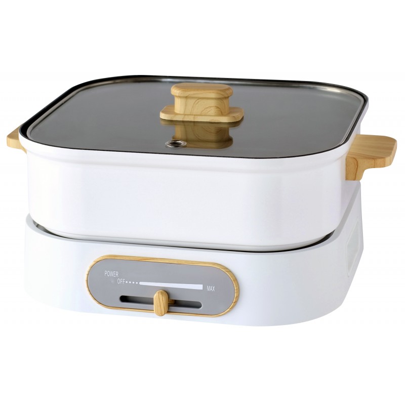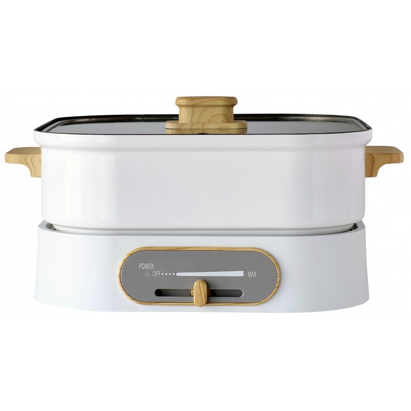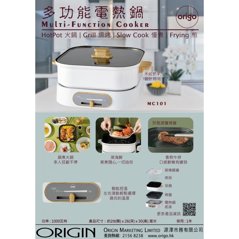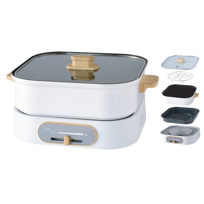 - 適合火鍋,蒸煮,慢煮,煮,烤,煎- 功率:1000W, 煮鍋容量: 約3升- 滑動開關控制溫度- 過熱保護- 防黏塗層可拆卸鑄鋁鍋- 包括煮鍋,烤盤,蒸架和頂蓋- 尺寸: 約20(W)x30(H)x26(D)厘米