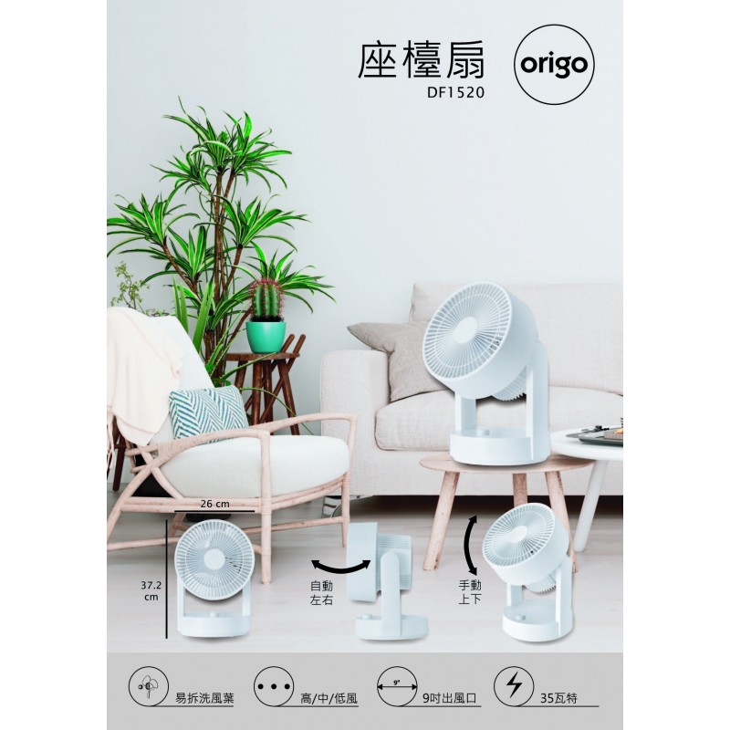 - 9.5"外網; 6"扇葉- 左右自動搖擺- 高/中/低/三段風速- 手動上下角度調校- 旋鈕式風量及搖擺控制- 功率 : 35瓦- 尺寸:約26(W)x37.2(H)x25.2(D)厘米