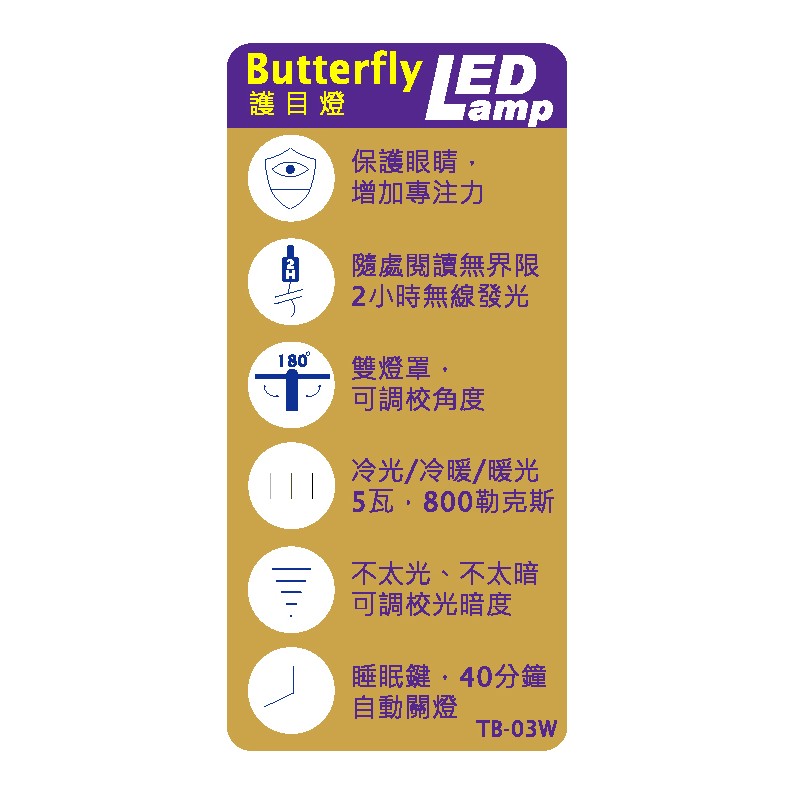 - 極低UV,光線柔和,保護眼睛- 減低疲勞,適合長時間閱讀使用- 蠂型雙燈罩,可以180度展開- 內置充電池,高達2小時無線使用- 可調色溫:冷光/暖光/冷暖混合- 光暗調節,輕觸控制- 40分鐘睡眠自動關燈- 附USB線及火牛- 5W,照度: 800 勒克斯(lx)