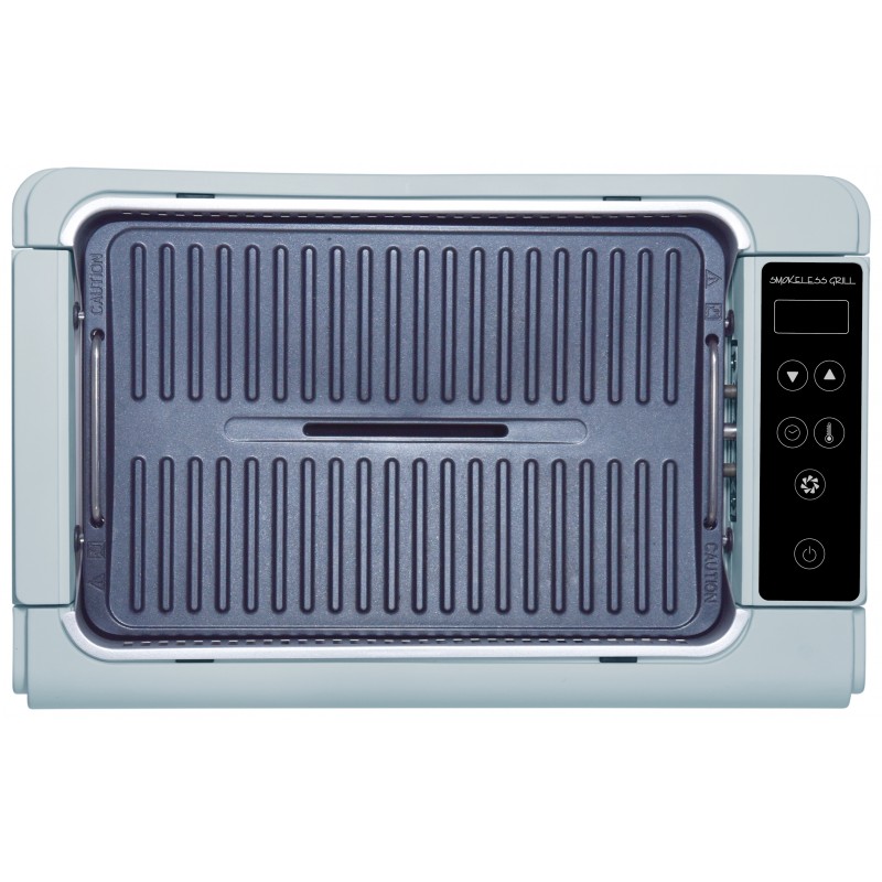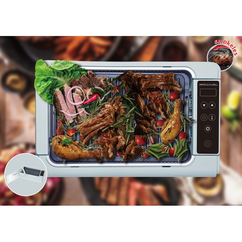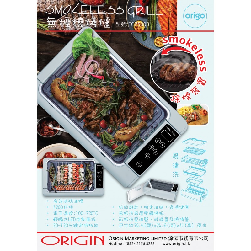 - 體積細小,易於收藏- 除煙裝置,有效減除油煙- 1200瓦特, 電子溫控:100-230°C- 輕觸式LED控制面板- 20-120分鐘定時功能- 易拆洗易潔壓鑄烤板- 坑紋設計,排走油脂,食得健康- 可拆洗盛油盤,玻璃蓋及燒烤盤- 產品尺寸: 約39.5(闊)x24.8(深)x11(高) 厘米