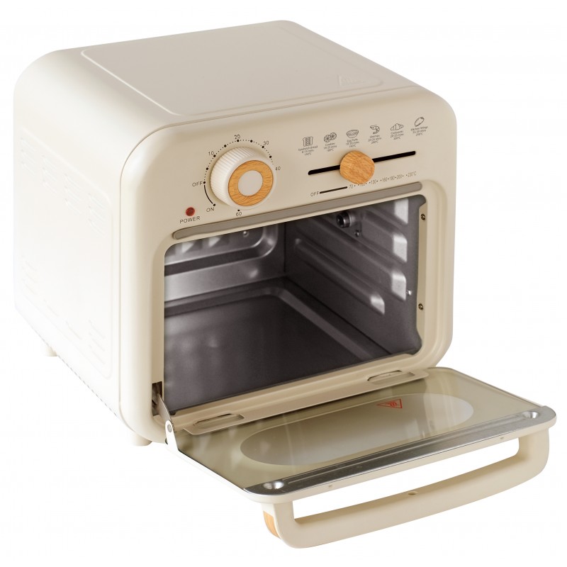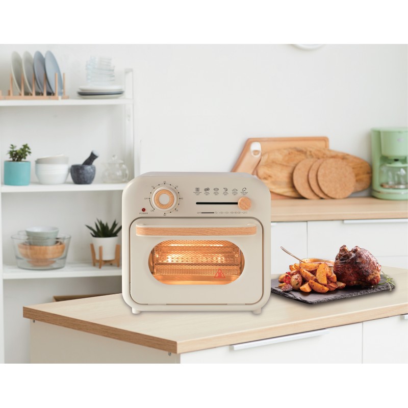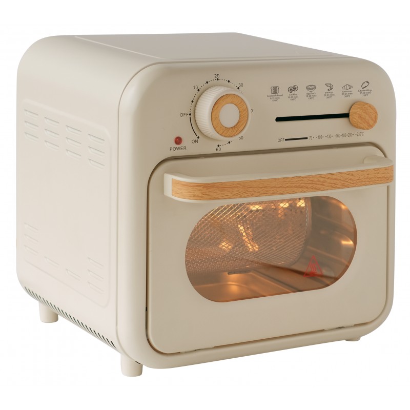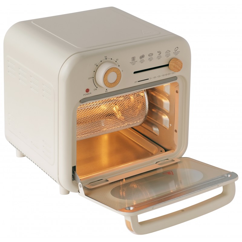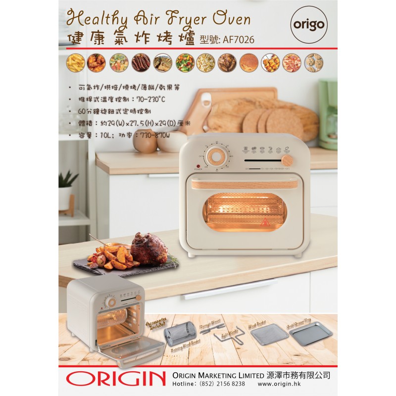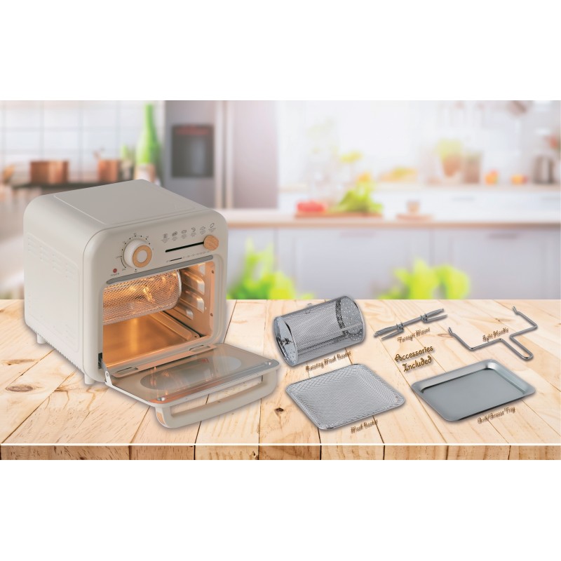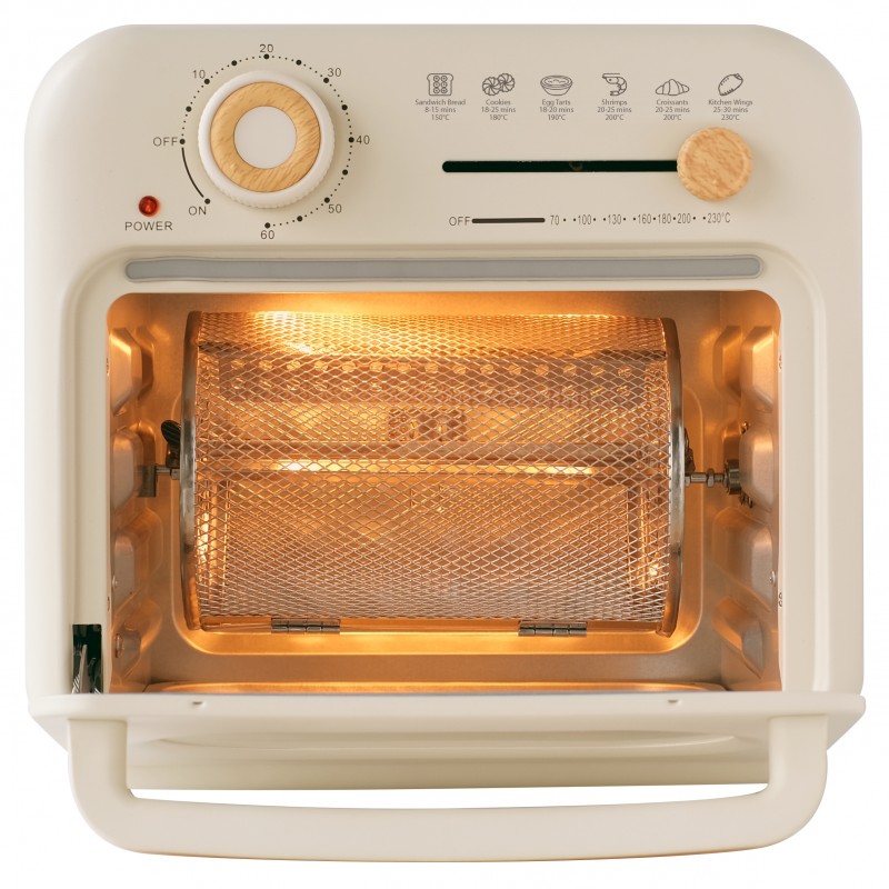 - 可氣炸/烘焙/燒烤/薄餅/乾果- 推桿式溫度控制:70-230°C- 60分鐘旋鈕式定時控制- 附旋轉網籃、網籃、盛油盤、燒烤叉、把手- 尺寸: 約29(W)x27.5(H)x29(D)厘米- 容量:約10L; 功率:730-870瓦特