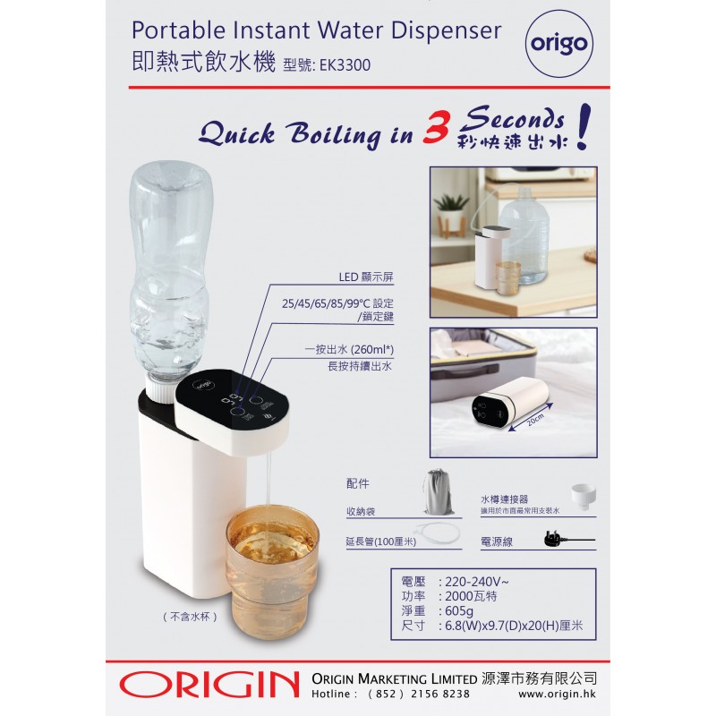 - 適合旅行/居家和辦公室- 約3秒即出熱水- 25/45/65/85/99℃設定- 2000瓦特- 260毫升或持續出水- 內含1米延長軟管- 附水樽連接器和收納袋- 尺寸:約6.8(W) x 20(H) x 9.7(D)厘米*不包括水樽和杯子