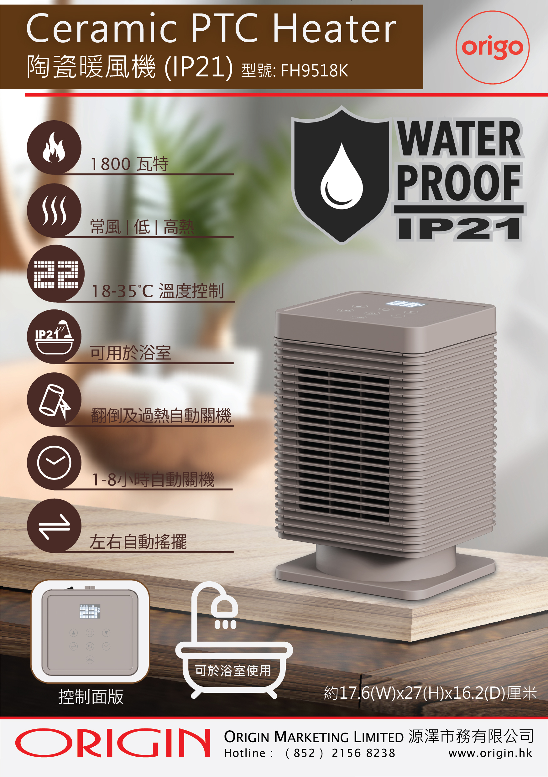- IP21防水級別,可於浴室使用 - PTC恆溫技術控制,額外安全舒適- 功率:1800瓦特- 低熱, 高熱及風扇- 翻倒及過熱自動關機裝置,格外安全- 1-8小時自動關機- 18-35℃電子溫度控制- 左右自動搖擺 - 尺寸: 約17.6(W)x27(H)x16.2(D)厘米