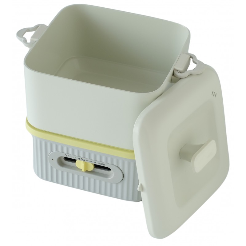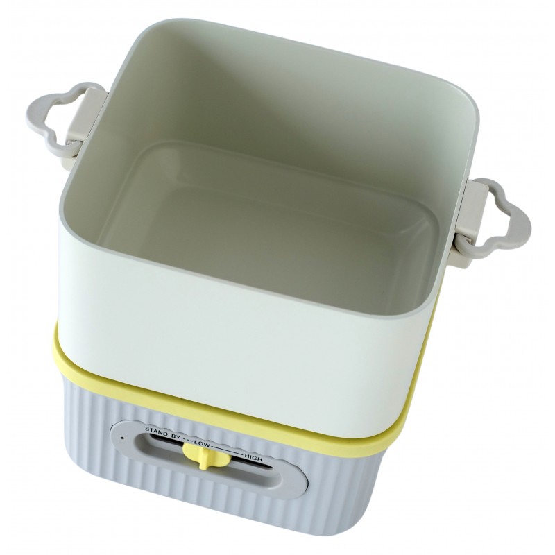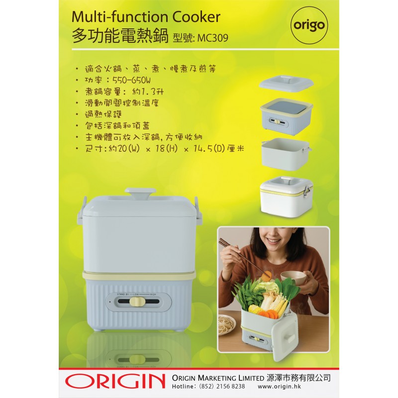 - 適合火鍋、蒸、煮、慢煮及煎等- 功率:550-650W, 煮鍋容量: 約1.3升- 滑動開關控制溫度- 過熱保護- 包括深鍋和頂蓋- 主機體可放入深鍋,方便收納- 尺寸: 約20(W) x 18(H) x 14.5(D)厘米