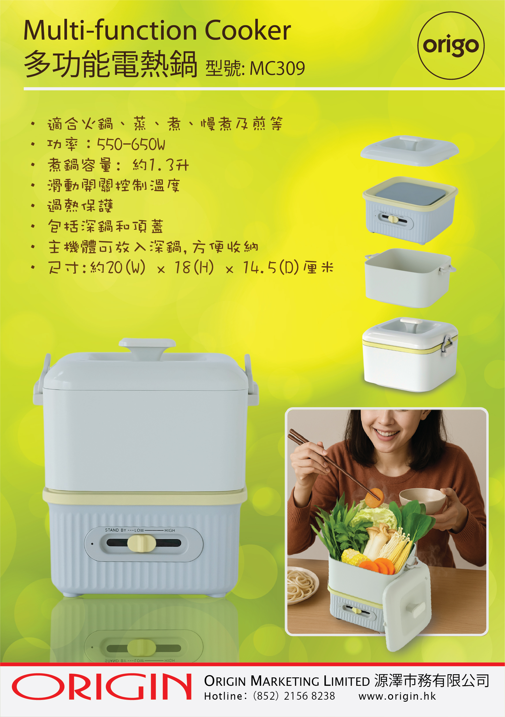 - 適合火鍋、蒸、煮、慢煮及煎等- 功率:550-650W, 煮鍋容量: 約1.3升- 滑動開關控制溫度- 過熱保護- 包括深鍋和頂蓋- 主機體可放入深鍋,方便收納- 尺寸: 約20(W) x 18(H) x 14.5(D)厘米